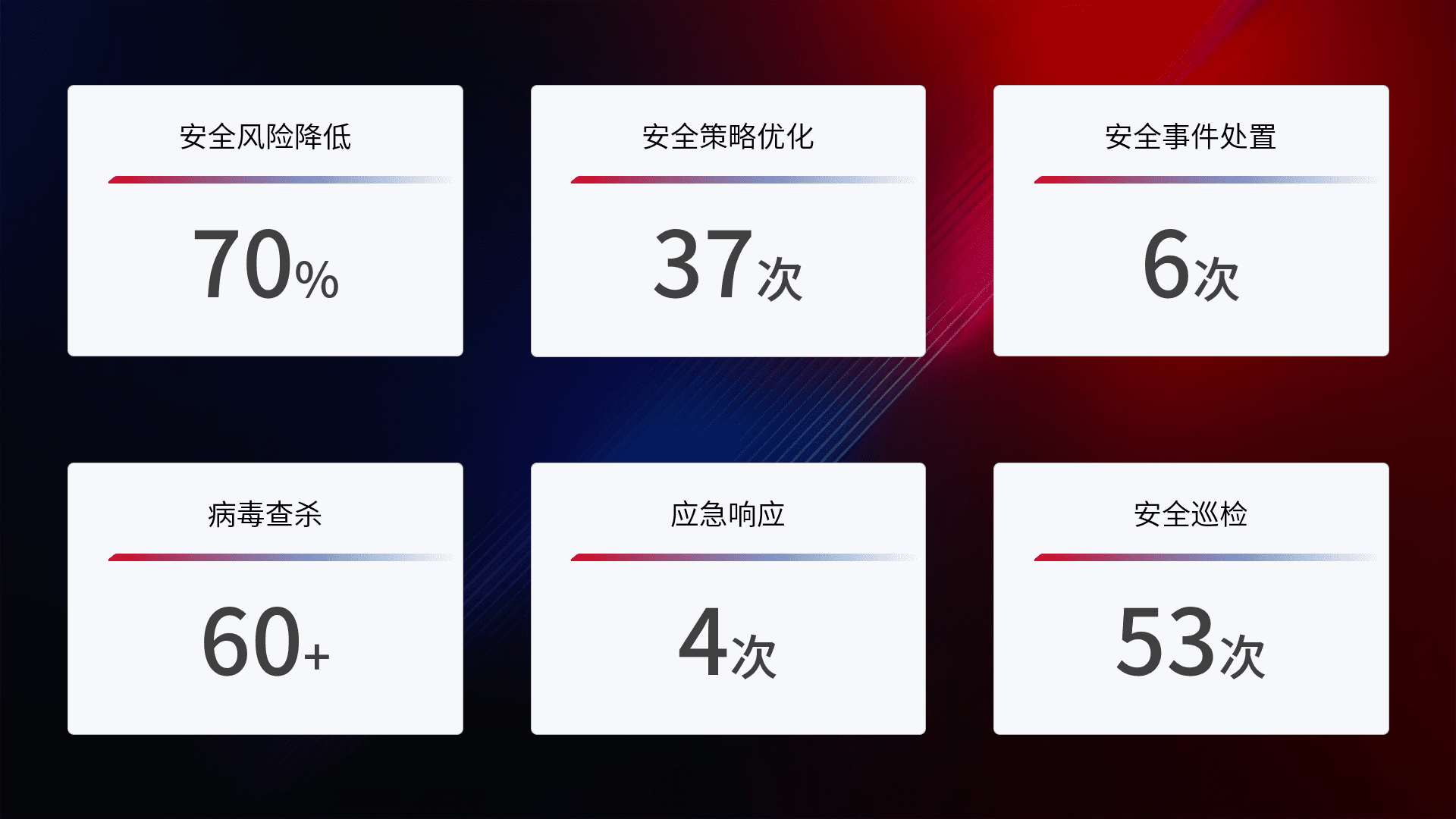 提供全面的安全事件报告体系,,,,包括处置报告、、、周报、、季度和年度总结,,,结合持续监控,,,帮助客户深入了解网络安全状况。。。