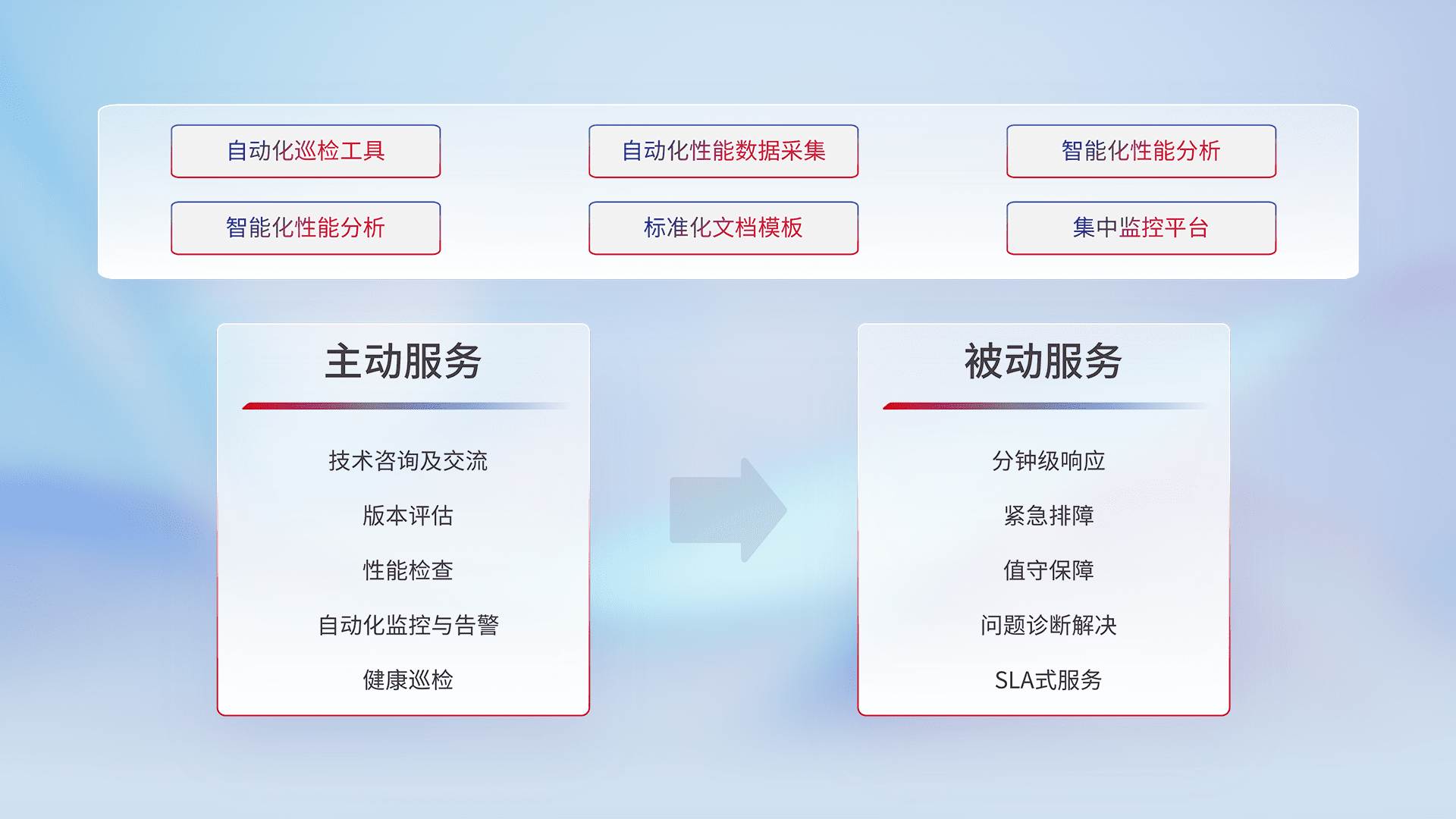 智能化工具和标准化文档,,,保障服务质量,,,提供主动服务(包含技术咨询、、、、版本评估、、性能检查、、自动化监控与告警、、健康巡检)和被动服务包含(分钟级响应、、紧急排障、、、、值守保障、、、、问题诊断解决、、、SLA服务)。。